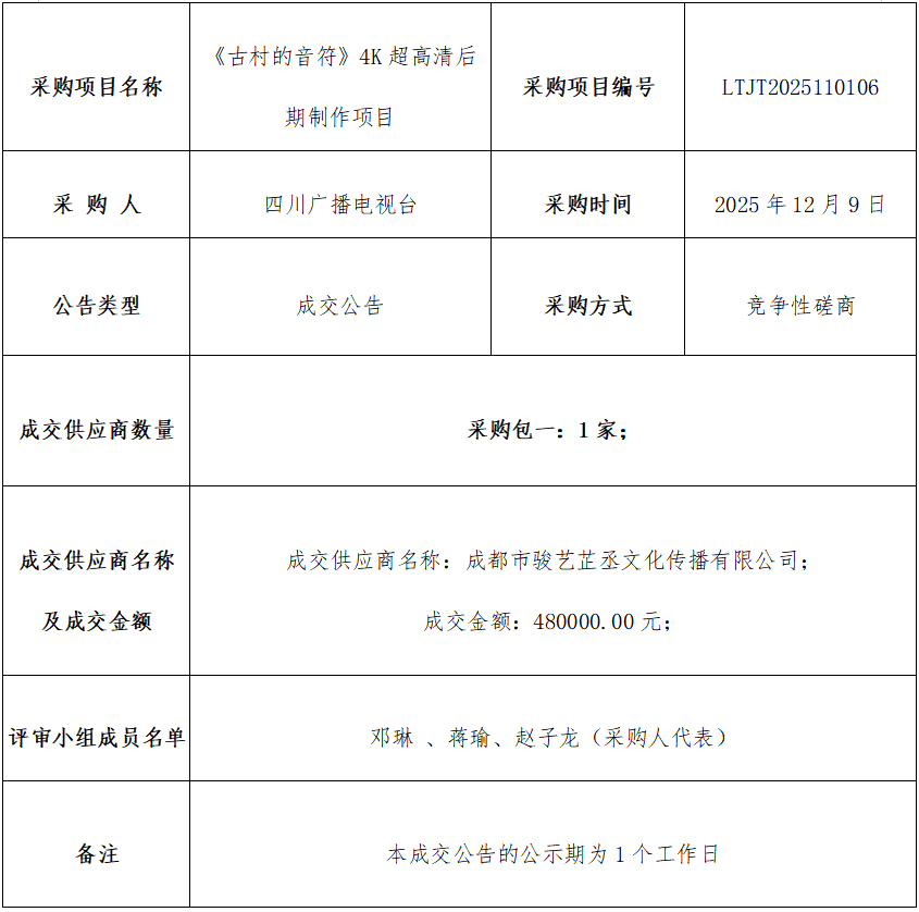 《四川广播电视台<古村的音符>4K超高清后期制作项目》成交结果公示