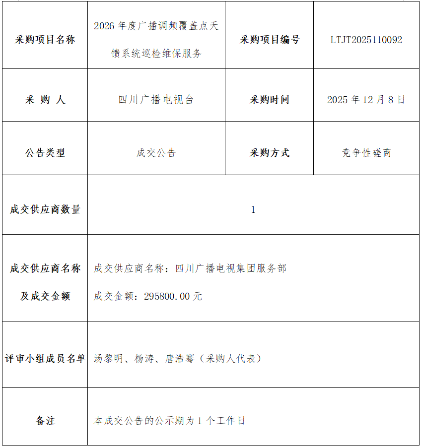 《2026年度广播调频覆盖点天馈系统巡检维保服务项目》成交结果公示